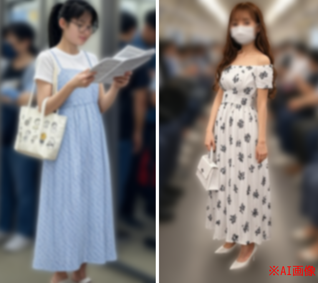 電車の走行音と共に、スカートがヒラヒラと揺れています。ふわりとスカートが大きく揺れた瞬間、お尻部分が丸見えに!